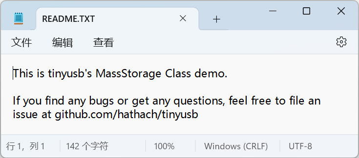 烧录成功后,插入USB,PC端会自动弹出U盘,显示默认README.txt文件。